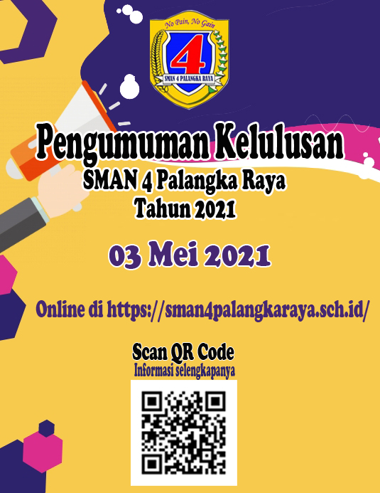 Pengumuman kelulusan siswa kelas XII SMAN 4 Palangka Raya, dilakukan secara online. Untuk mendapatkan informasi kelulusan siswa kelas XII dapat membuka website SMAN 4 Palangka Raya. Pada halaman web silakan pilih menu Aplikasi kemudian menu Pengumuman Lulus